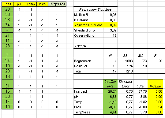 We run the Regression again keeping only the factors and interactions not removed (sheet Reduced model):
