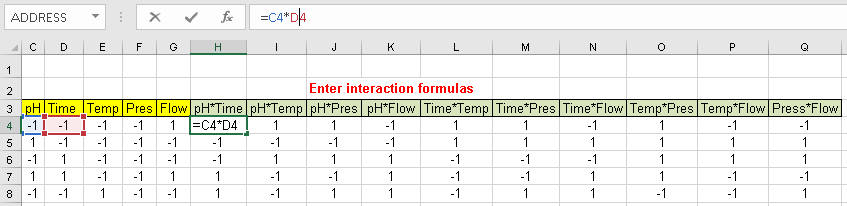 We want to be able to estimate the influence of each individual factor in the result, but also the interactions among them, so before we analyze the results we will build a column for each interaction among 2 factors.