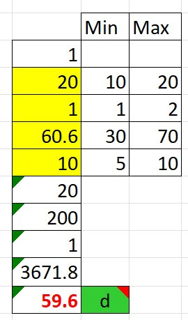 We prepare the yellow cells to contain the values of f, m, a, l that Solver will calculate to maximize distance d (R26).